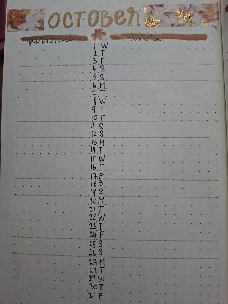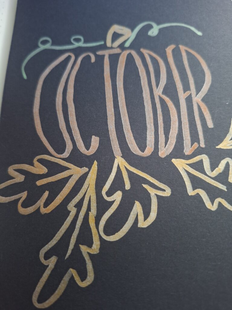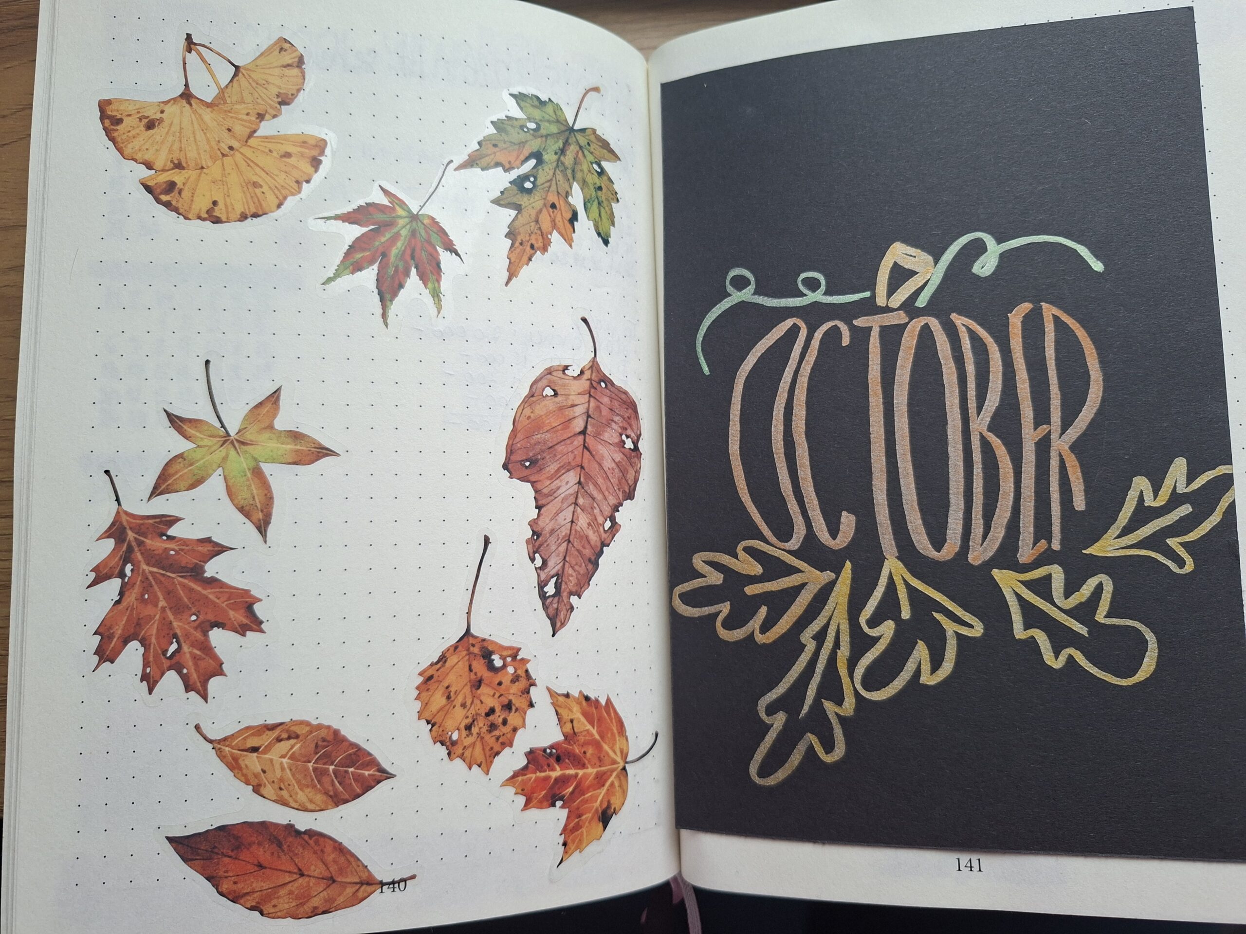 For the title page, I got the inspiration from Pinterest. I wanted to use my metallic brush pens, and I thought that they would look best on black paper, so I used some black craft paper. When I finished setting up my bullet journal, I started to feel sorry for that sad, empty sheet next to the title page, so I put down some leaf stickers to add to the autumn mood.