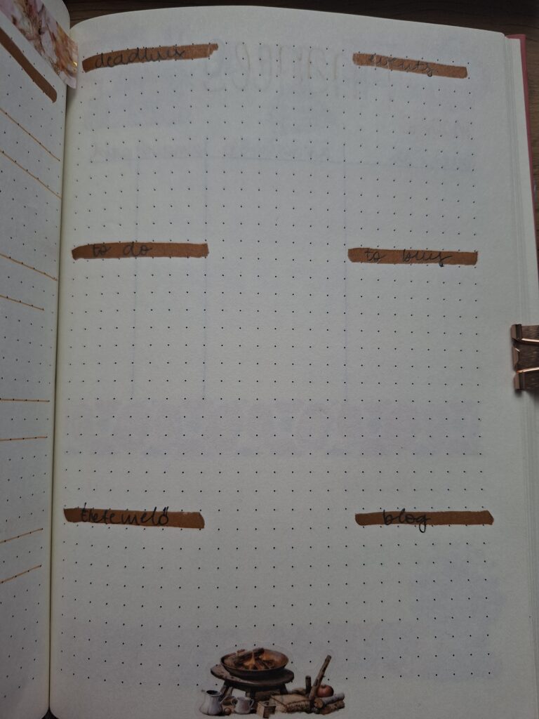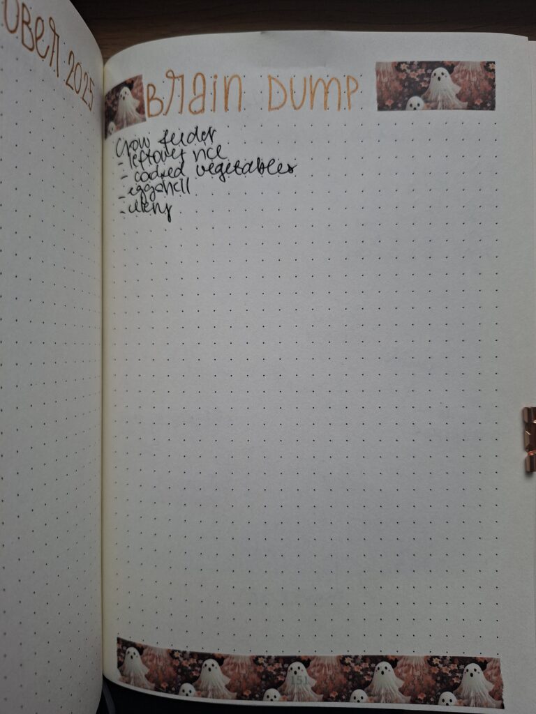 Last but not least, a very important page for a person whose mind is working at full speed non-stop: Brain dump. This is where I take notes of ideas or things I want to look up. This time, I’m planning to make a crow feeder; this is what I started to collect ideas for. I decorated it with Halloween washi.
