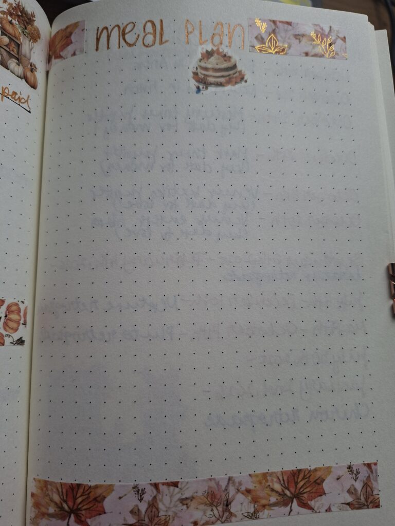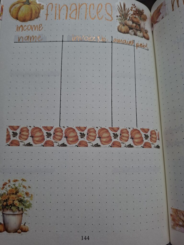 Let’s move on to the Finances page. This one is essential because I’m self-employed, and it makes managing my outgoing invoices and income a lot easier. Next to it, you can see the meal plan page. It isn’t divided into sections because I use it as a kind of brainstorming page for food I want to cook throughout the month. I wrote the titles and the sections of the chart with a gel pen with bronze ink in it.