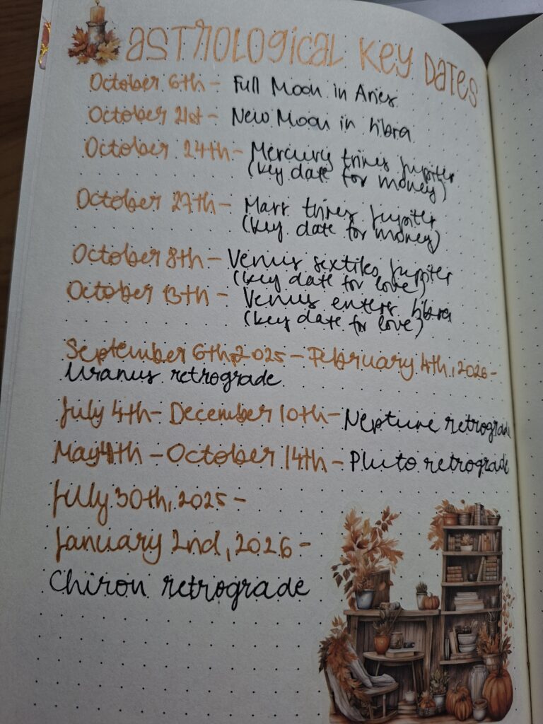 I’ve been into astrology and tarot since 2020. I haven’t included such pages in my bullet journal until this year, but especially since August, interesting astrological events have been taking place, so I make sure to put them in my journal. I also leave some space for Full Moon, New Moon and monthly readings.